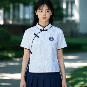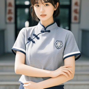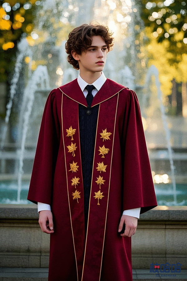 The jacquard dark pattern on the body of the gown is in the veins of a school tree maple leaf, and the edges of the draped fabric are hand-locked with maple leaf gold embroidery.