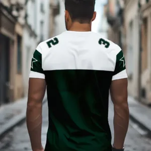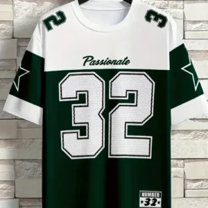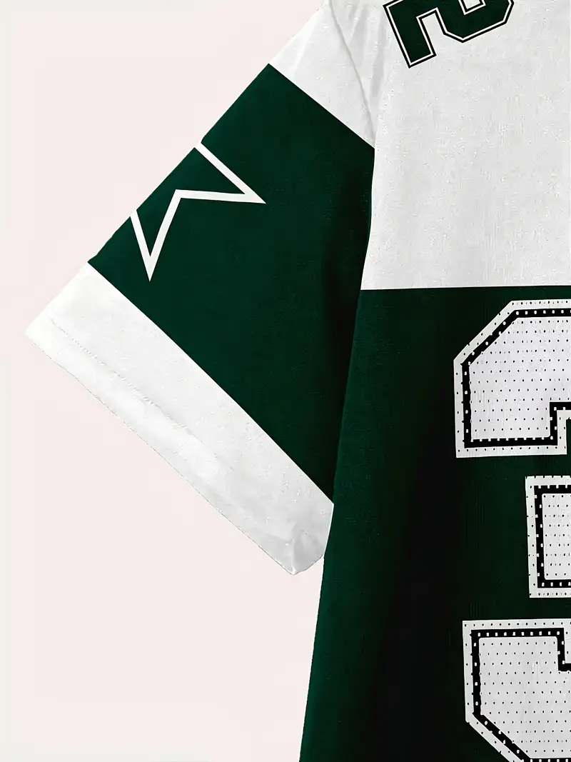 Men’s Summer Casual Crew Neck Sports Top – Short Sleeve, Green & White Color Block with Print Number 32 Design, Lightweight Polyester Fabric for Outdoor Activities