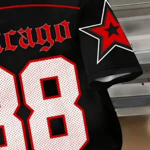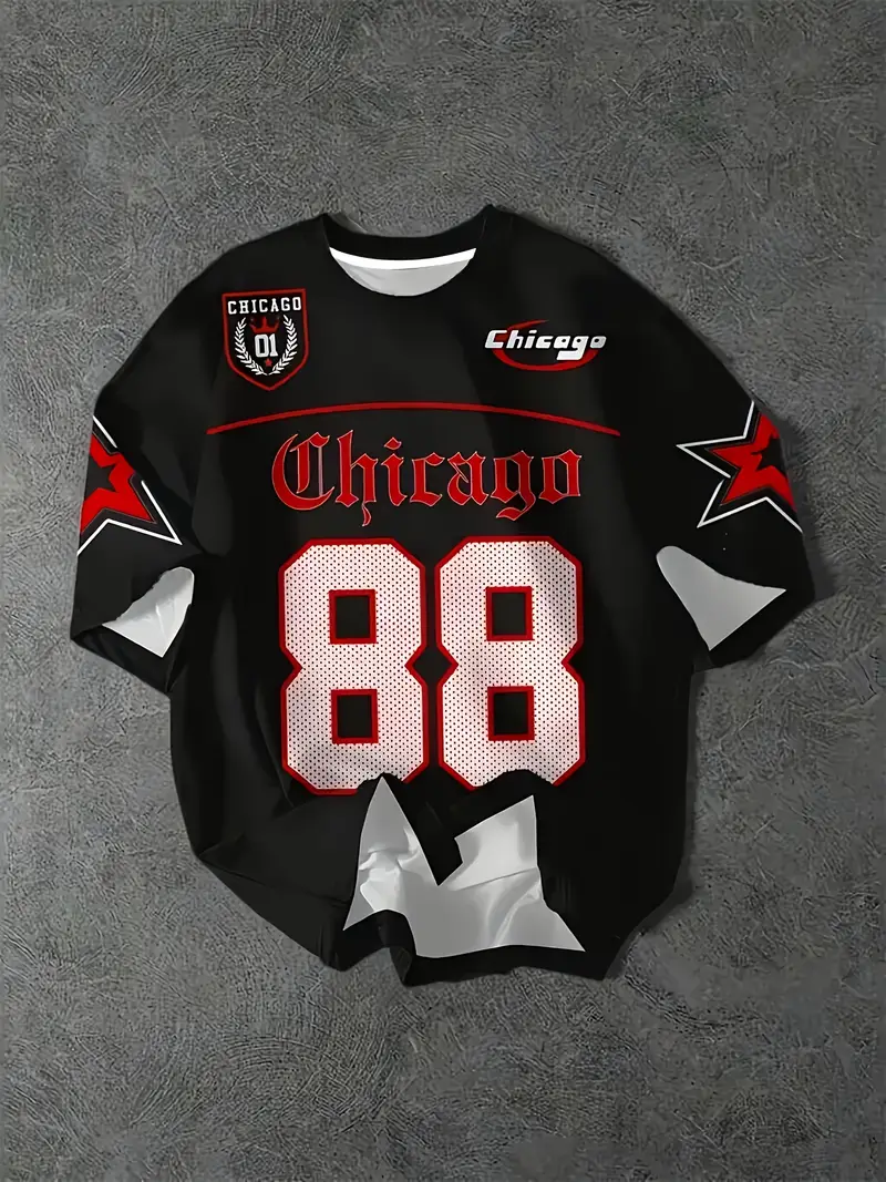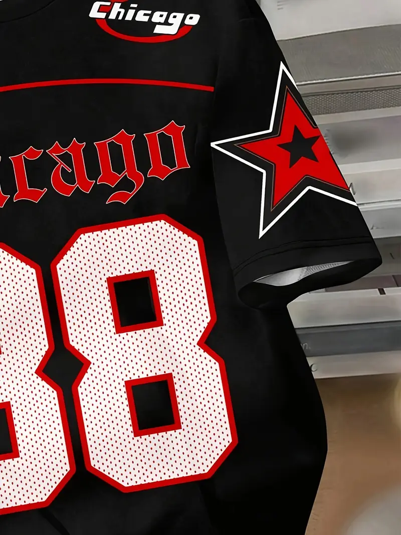 Chicago Graphic Tee with Red Accents, Lightweight Polyester Knit Shirt for Everyday & Special Occasions, Ideal Gift for Sports Fans – Urban Streetwear Essential, Chicago T Shirt, Casual Wear, Sporty Design, Stretch Fabric