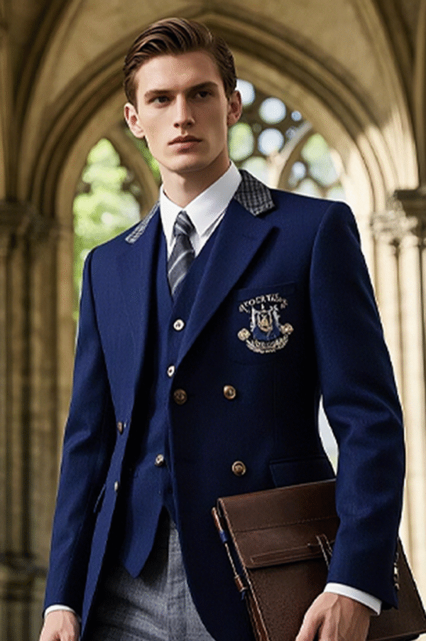 Short suit in dark indigo worsted wool with a single row of two customized brass buttons engraved with the motto ‘FLOREAT ETONA’ and a collar with a dark stripe appliqué;