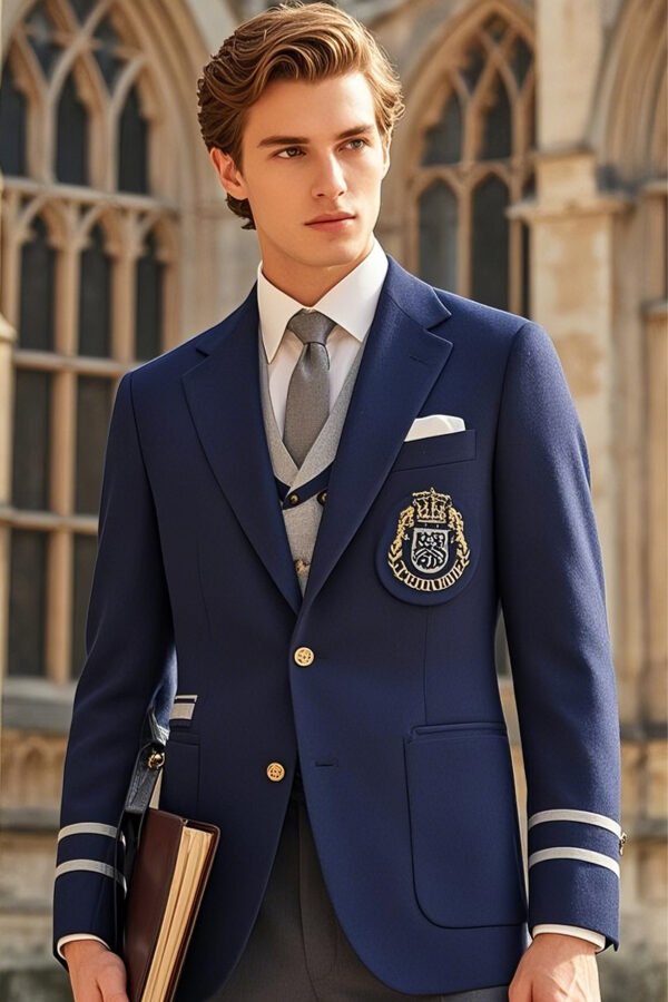 Short suit in dark indigo worsted wool with single row of two bespoke brass buttons engraved with the ‘FLOREAT ETONA’ motto, barge lapels lined with a gold-stamped Windsor Castle motif;