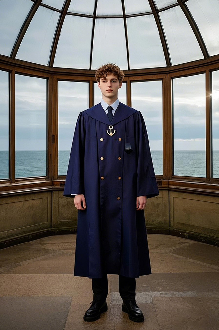 The draped fabric is patterned with abstract lines of sailboats and compasses, with brass anchor buttons replacing traditional buttons.