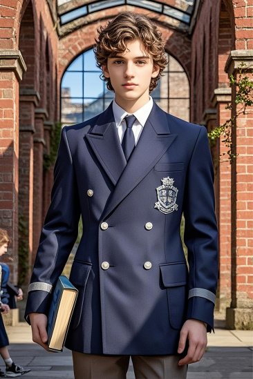 Navy blue double-breasted blazer, three-dimensional waist cut to show off the slender figure, cuffs folded to reveal the silver-gray school motto embroidery.