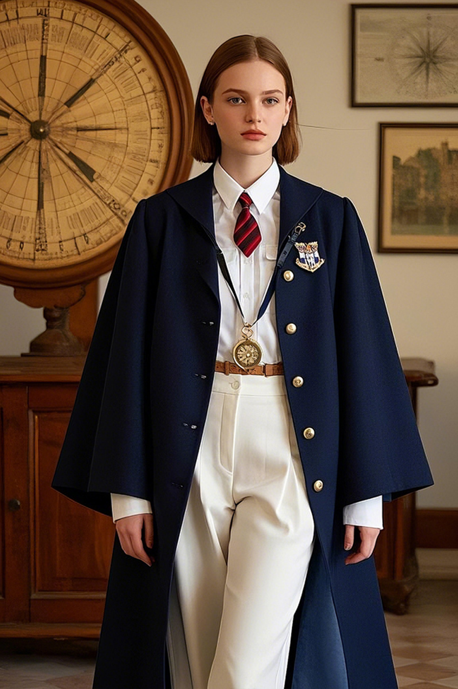 A short double-breasted degree gown in dark navy (the length of the garment only covers the hips) with white wide-leg nautical tweed pants underneath, the drape changed to removable leather straps inlaid with the school’s crest enameled insignia.