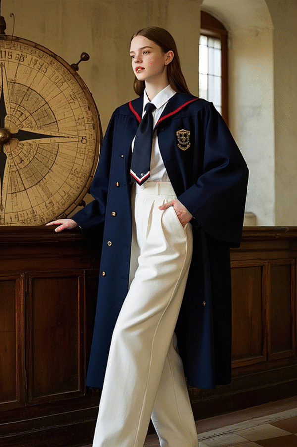 Worn with white wide-leg nautical tweed pants, the draped fabric is replaced with removable leather straps set with the school’s enameled crest.