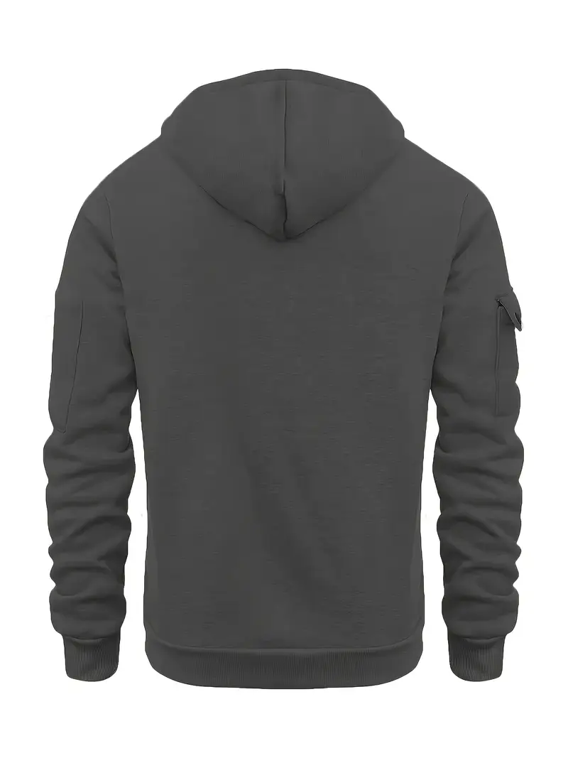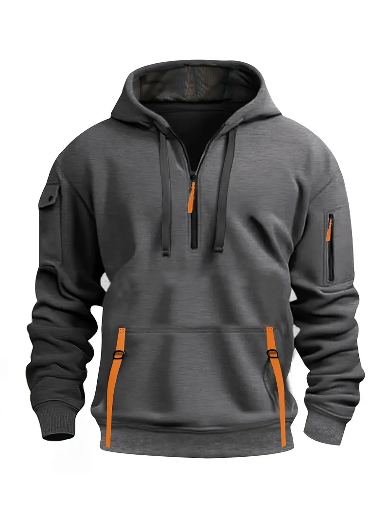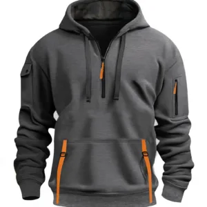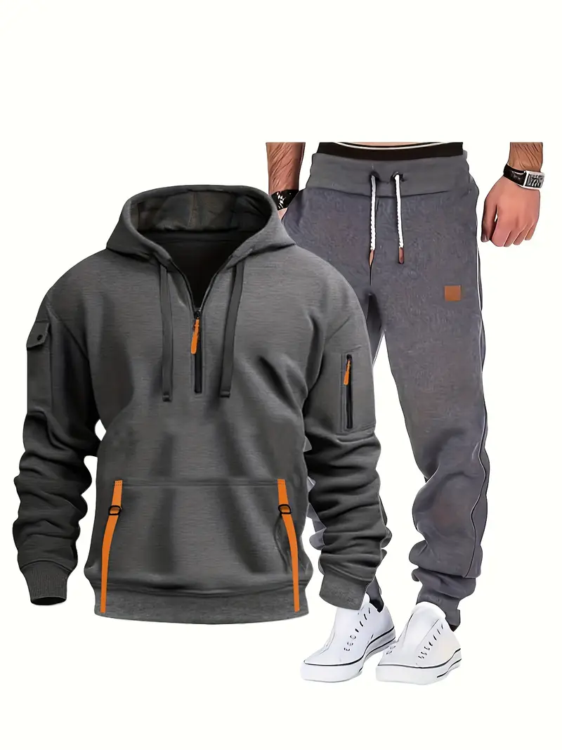 Gray Half-Zip Hoodie with Orange Accents & Utility Pockets, Matching Joggers, Perfect for Weekend Casual Wear
