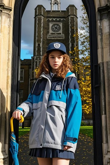 Gray and blue patchwork punching bag with umbrella in left hand standing under gothic arch of school building with bell tower pattern lining in brim.
