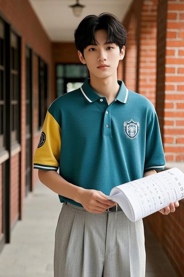 Lake ripple stand-up collar + library silhouette shoulder trim (localized from the Eton version).